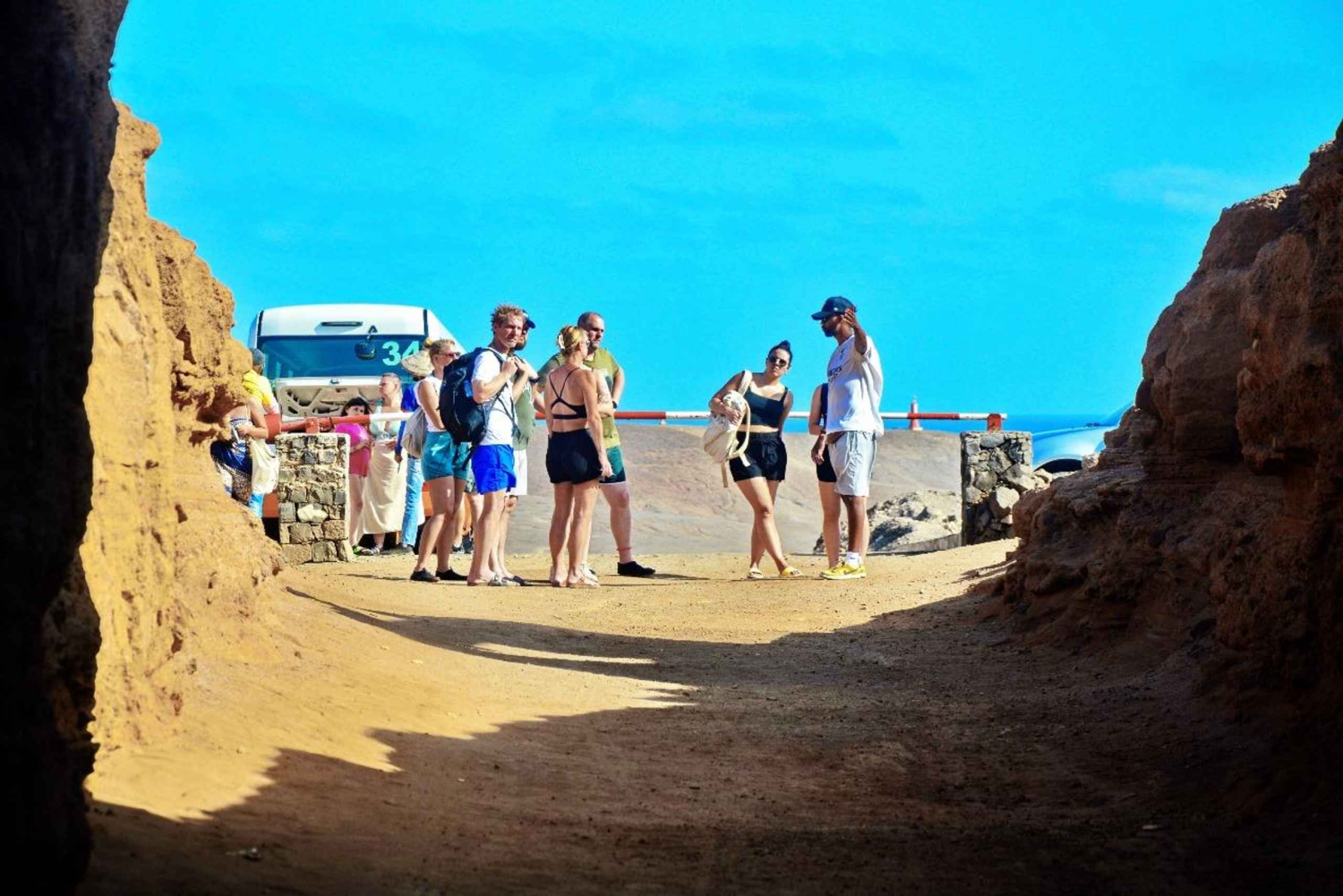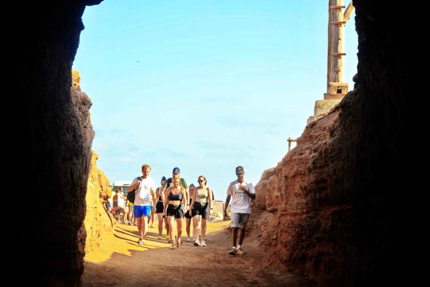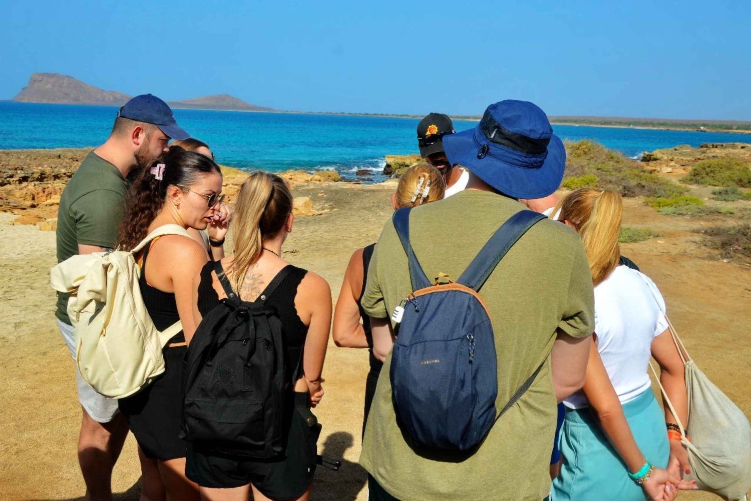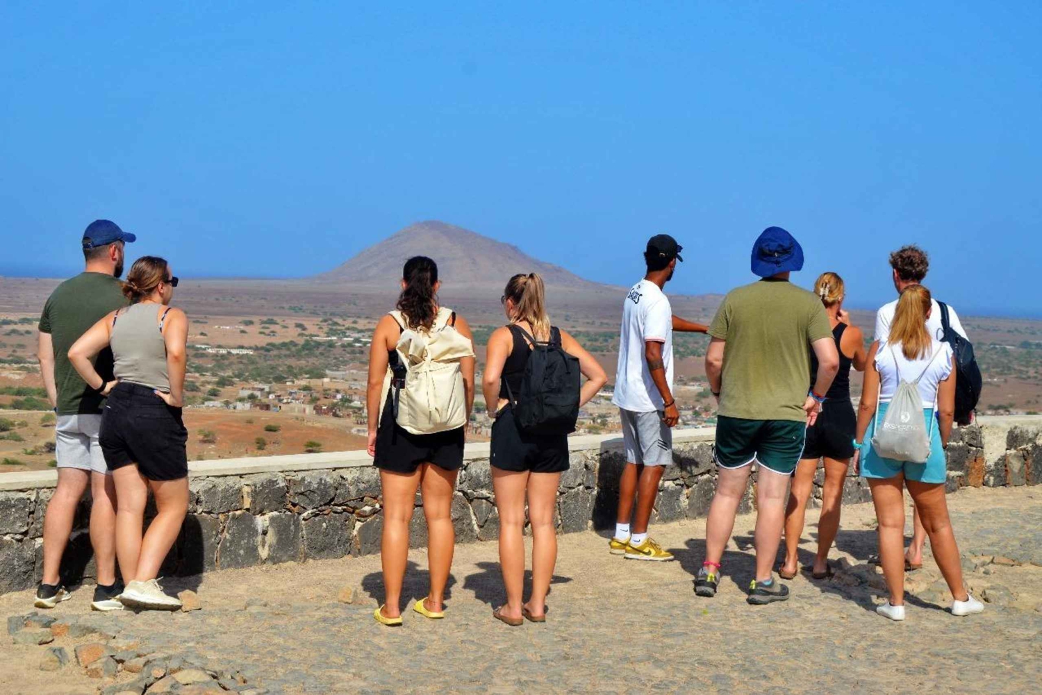 استكشف جزيرة سال وسحرها الخفي في سال، الوجهة الأكثر هجراً وسحراً في الرأس الأخضر. ستبدأ جولتك في ميراجيم دي فاتامورغانا مع أوهام المياه في الصحراء ثم سنواصل جولتنا لزيارة العين الزرقاء في بوراكونا التي تعد عملاً فنياً أصيلاً من أعمال الطبيعة، وهناك بركة داخل بوراكونا حيث يمكنك السباحة قليلاً إذا كان البحر جيداً. ثم سنذهب بعد ذلك إلى خليج الديدان الأنبوبية الليمونية، وهو نوع من أسماك القرش التي تعيش في المياه الضحلة. ستمشي حوالي 50 متراً في المياه التي يصل عمقها إلى الركبة ثم تشاهد الحيوانات. في النهاية سنطفو في البحيرة المالحة في مسطحات بيدرا دي لومي المالحة بمياهها الصافية الكريستالية. تحتوي المياه في المسطحات الملحية على نسبة عالية من الملح. عندما تستحم، ستشعر بنعومة بشرتك عند الاستحمام. يمكنك أيضاً استخدام الطين لترطيب بشرتك. بعد ذلك، سنعود إلى سانتا ماريا.Includes