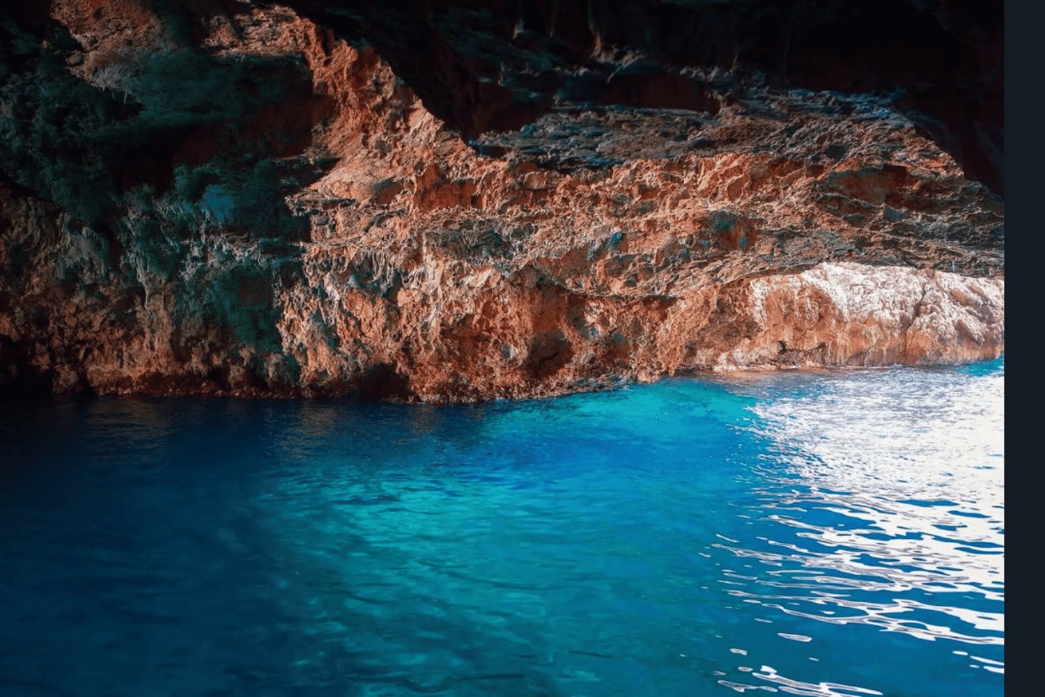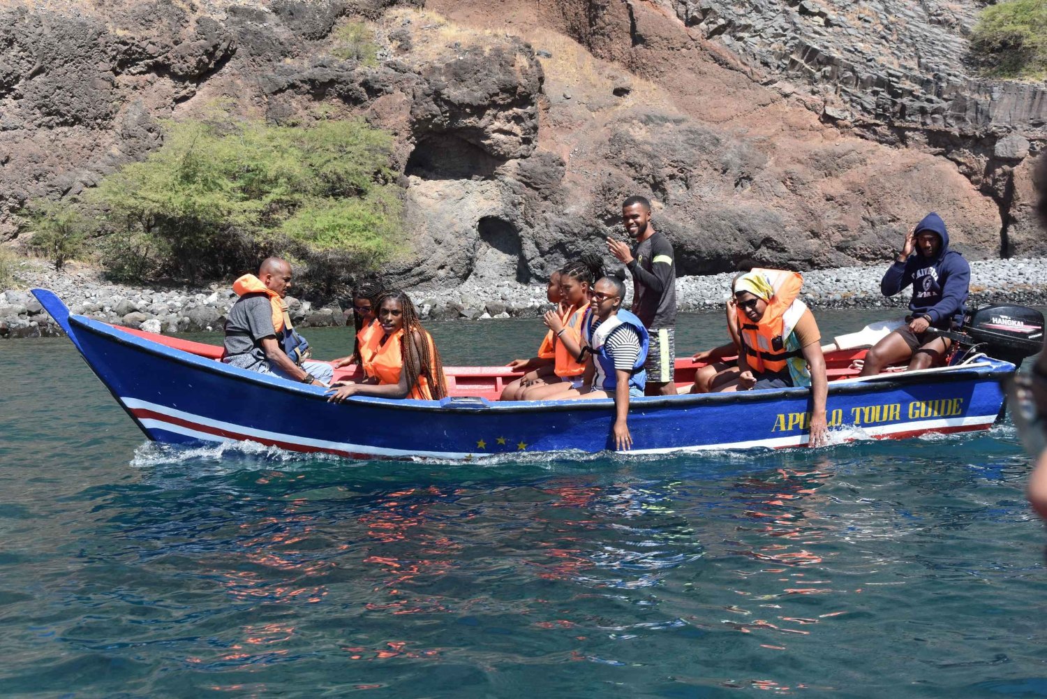 Navega por la costa oeste de la isla de Santiago en un viaje en barco a las cuevas de Aguas Belas. Nada, practica snorkel y disfruta de una comida en la playa desierta de Angra.