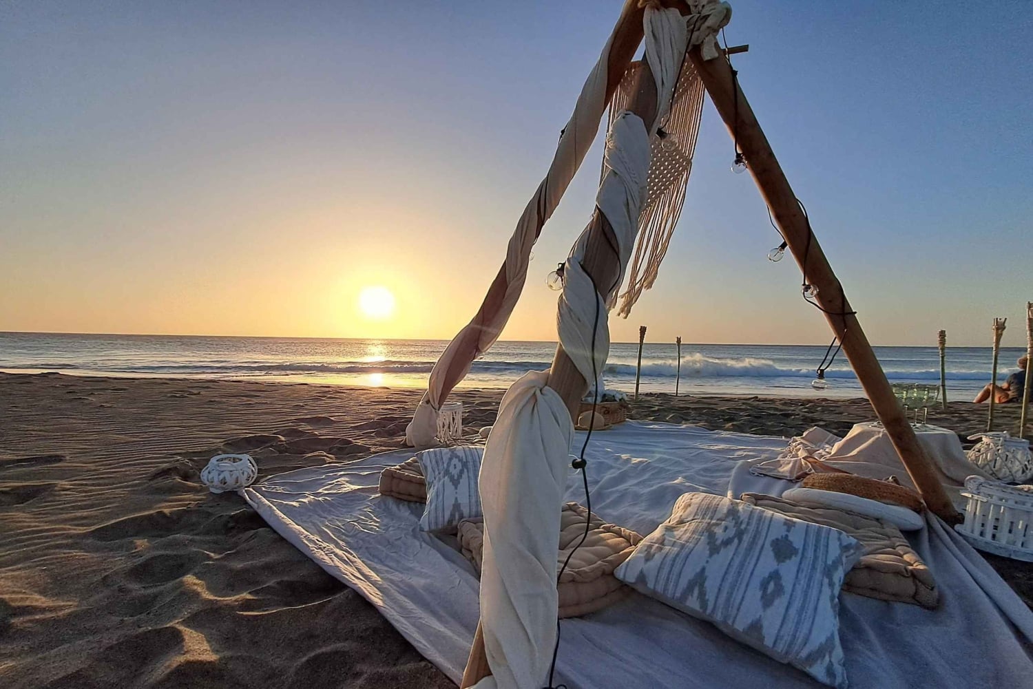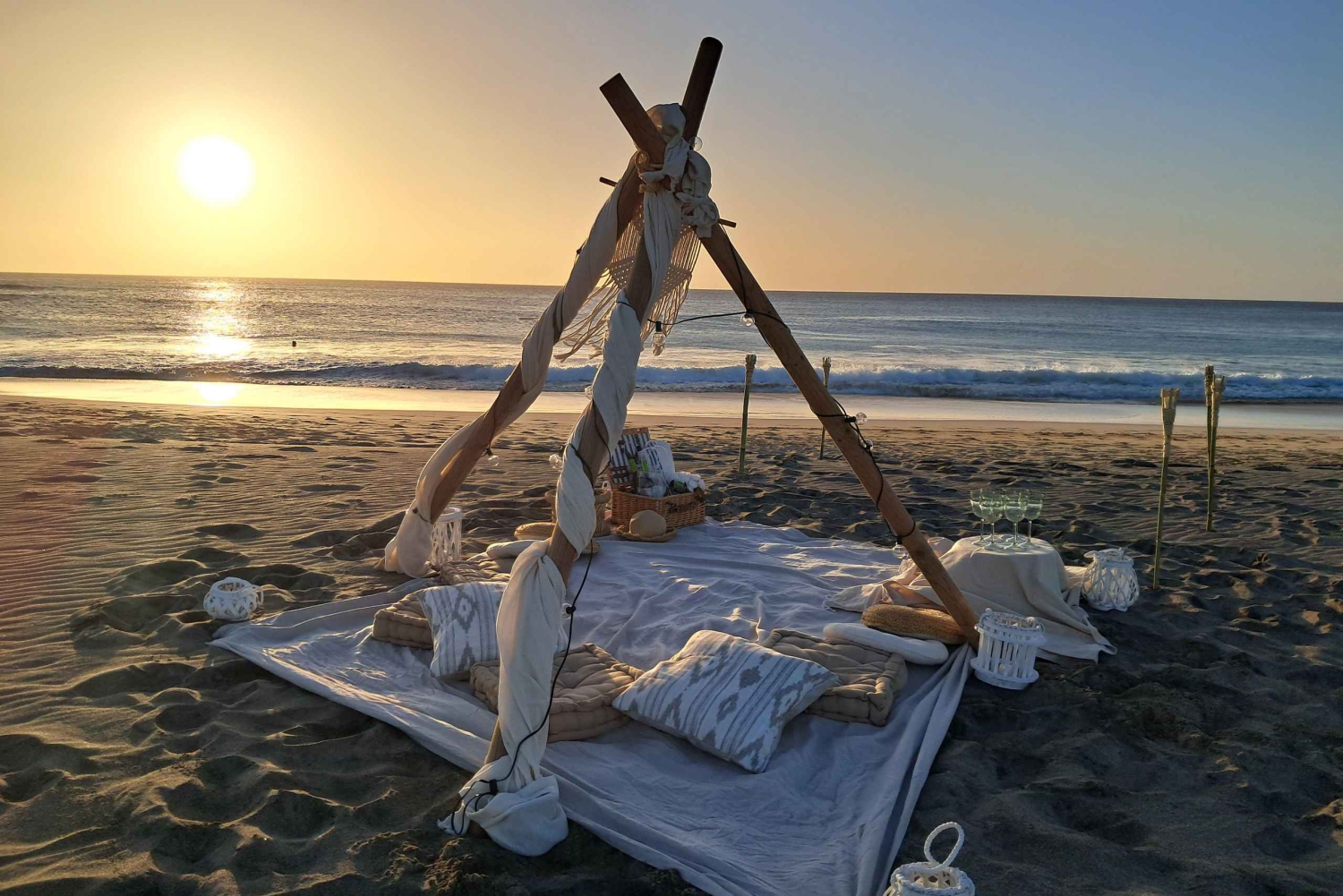 Transporte privado de ida y vuelta Botella de vino caboverdiano de primera calidad Montaje boho-chic con suaves pareos, cojines de felpa, antorchas encendidas y velas parpadeantesImportant Information