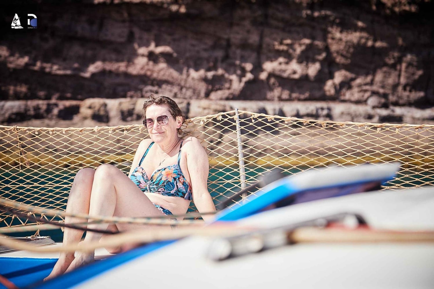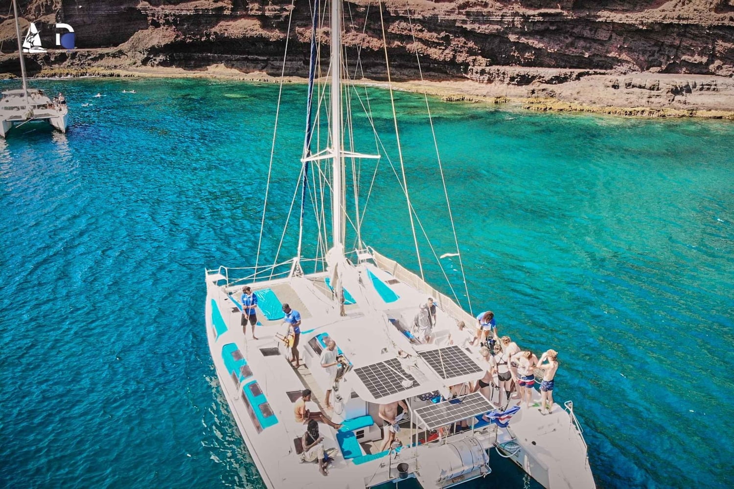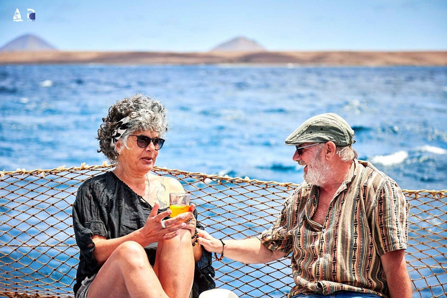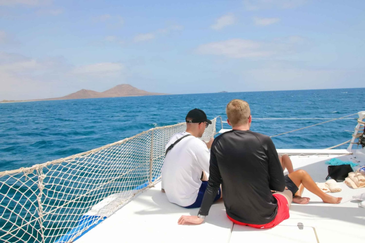 Embárcate en un recorrido en catamarán por la impresionante costa de Sal, Cabo Verde. Tu excursión comienza con la recogida en tu hotel y un corto trayecto por la isla hasta el puerto de Palmeira. Allí te subirás a bordo del Makaira, un catamarán espacioso y cómodo, y disfrutarás de un ambiente relajado y agradable mientras te deslizas por las aguas cristalinas del Atlántico.