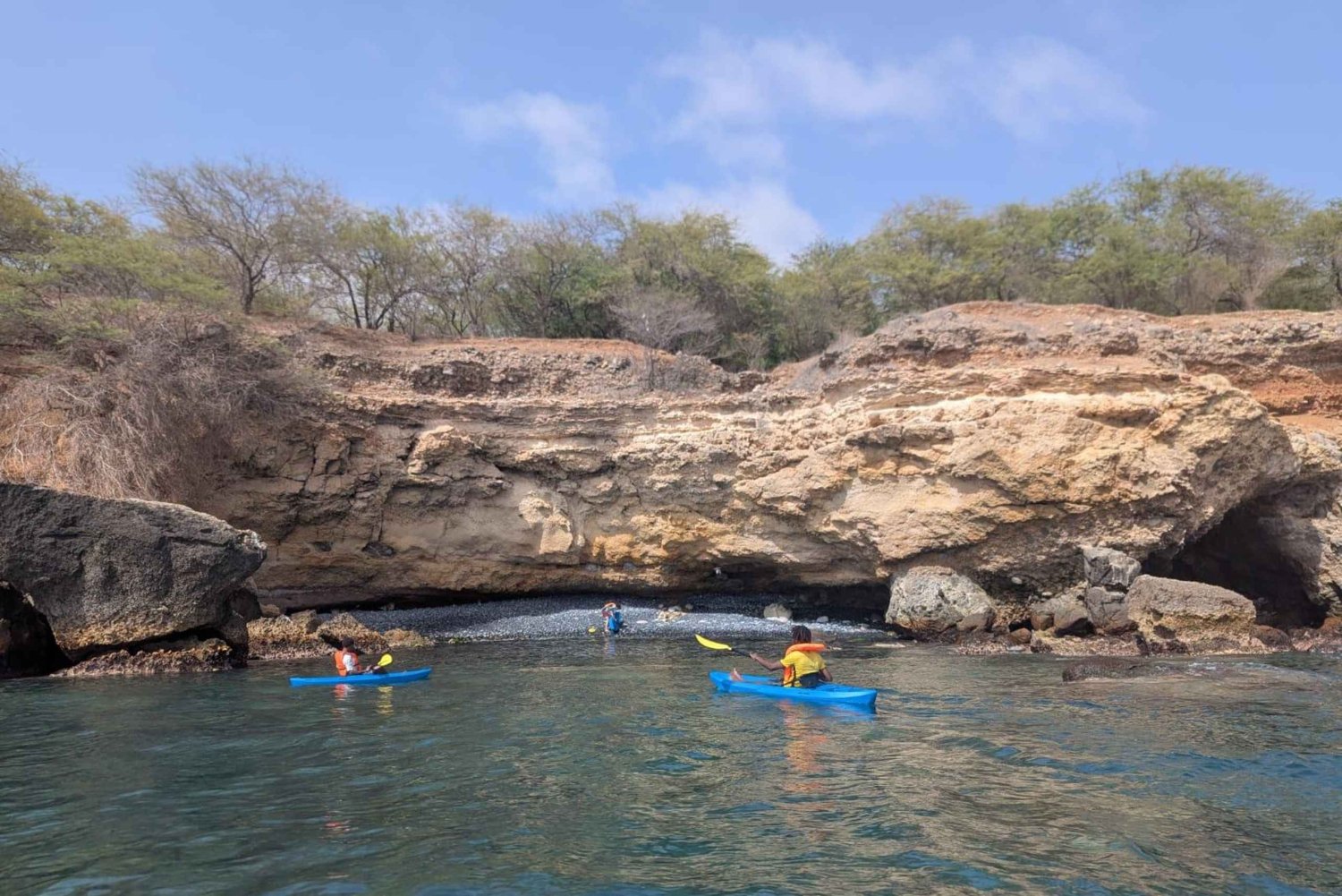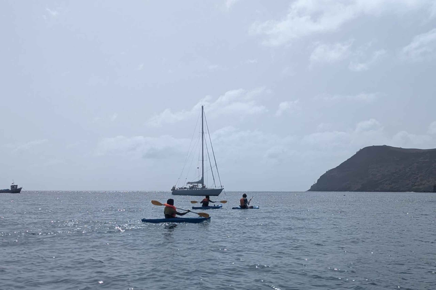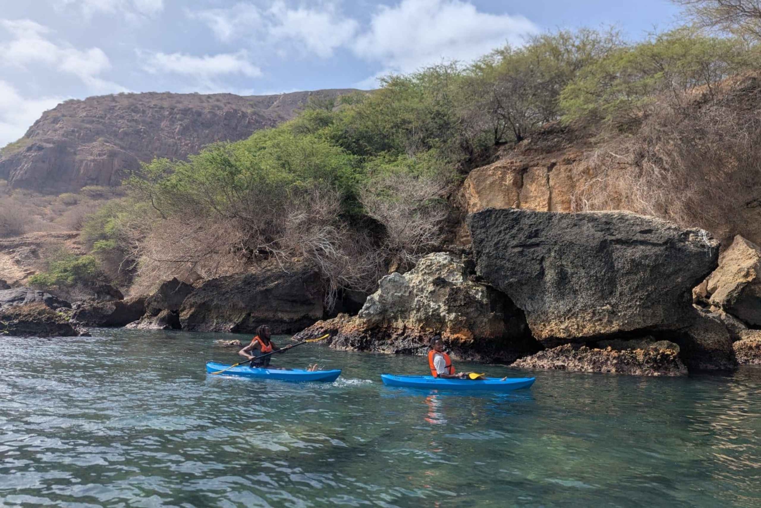Begin your adventure with a short safety and paddling lesson from a professional instructor. Then, get into your stable solo kayak, designed to be safe and comfortable for all skill levels. Guided by your instructor, paddle through the calm, clear waters of Tarrafal Bay, enjoying amazing views of the coast. If you feel confident, choose to explore further out toward the lighthouse. If you prefer a relaxing experience, stay closer to the bay. Your guide will adjust the route based on your comfort and interest. Paddle into small lagoon caves along the cliffs, visit unique beaches made of seashells, and see impressive rock formations shaped by nature over time. Enjoy panoramic views of the coastline from the water. This tour is a great way to experience nature, enjoy gentle exercise, and see hidden parts of Tarrafal that you can only reach by sea — all in a safe and relaxing setting.Includes