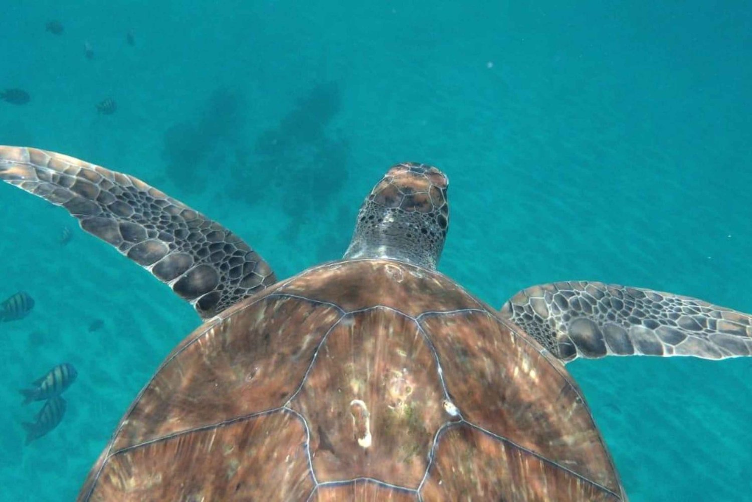 Seikkailu alkaa mukavalla noudolla hotellistasi Mindelossa tai sen ympäristössä, jossa sinut toivottaa tervetulleeksi ystävällinen ja kokenut paikallinen opas. Lyhyen matkan aikana Praia de São Pedrolle saat kuulla mielenkiintoisia tietoja São Vicenten saaresta, merielämästä ja kilpikonnien merkityksestä Kap Verden ekosysteemille. Saapuessasi São Pedron rannalle, joka on yksi saaren kauneimmista, ammattitaitoisten ohjaajien tiimi toivottaa sinut tervetulleeksi. Ennen kuin menet veteen, saat turvallisuustiedotuksen ja selityksen siitä, miten käytät snorklausvälineitä (maski, snorkkeli ja evät) oikein. Sitten opas vie sinut lahden kristallinkirkkaisiin vesiin, joissa taika alkaa: sinulla on ainutlaatuinen mahdollisuus uida merikilpikonnien rinnalla niiden luonnollisessa elinympäristössä. Nämä majesteettiset olennot ovat rauhallisia ja uteliaita, mikä tarjoaa jännittävän ja unohtumattoman kokemuksen. Aktiviteetin aikana oppaat ovat aina lähellä varmistaakseen turvallisuutesi ja auttaakseen sinua nauttimaan snorkelaamisesta. Kilpikonnien lisäksi voit nähdä muita merieläimiä, kuten värikkäitä trooppikalajeja ja Atlantin tyypillistä vedenalaista elämää. Snorklausretken jälkeen sinulla on vapaata aikaa rentoutua rannalla, ottaa kuvia tai vain nauttia São Pedron upeasta maisemasta. Lopuksi palaat ajoneuvoon paluumatkaa varten ja päätät tämän elämyksen ainutlaatuisiin muistoihin São Vicenten saaresta ja kohtaamisesta merikilpikonnien kanssa.Includes