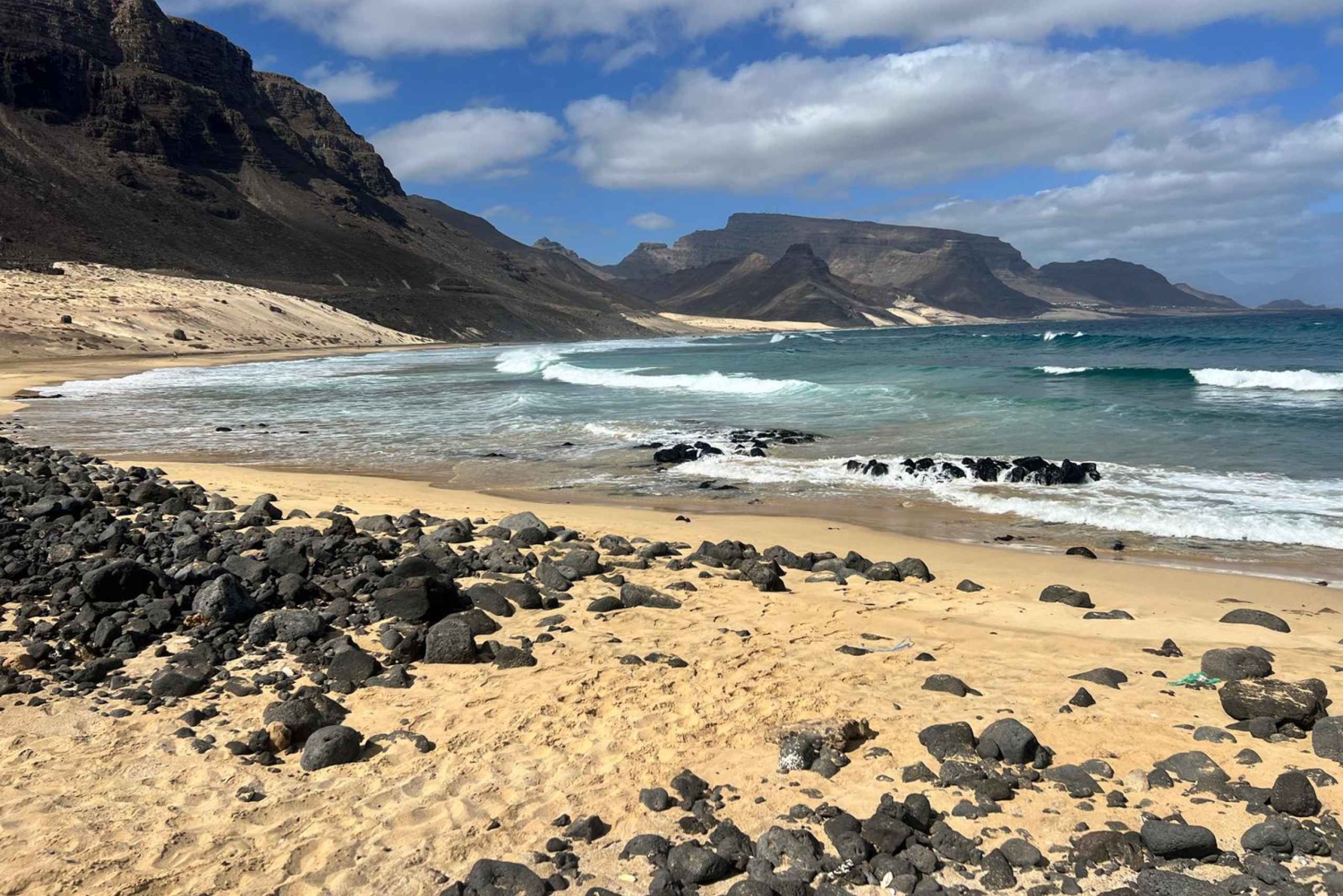 Stel je een rustige wandeling voor langs de kust van een strand, tussen twee vulkanen door. Een van de geologische monumenten van het eiland, gelegen in de oostelijke regio, vlakbij het kleine dorpje Calhau. Hoewel de vulkaan momenteel niet actief is, vormt hij een belangrijk onderdeel van het vulkaanlandschap van het eiland, dat bestaat uit sintelkegels, gestolde lavavelden en kale terreinen die de vulkanische activiteit weerspiegelen die het eiland in de loop der tijd heeft gevormd. Het gebied rond de vulkaan wordt gekenmerkt door donker, rotsachtig terrein met weinig begroeiing, waardoor een woestijnachtig en bijna maanlandschap ontstaat. Het ritmische geluid van golven die zachtjes op het zand slaan dient als een natuurlijke soundtrack. De frisse, zoute zeebries beroert je gezicht en geeft je een gevoel van vrijheid en rust. Het zachte zand omarmt je voeten bij elke stap en zorgt voor een lichte verzakking bij elke beweging. Rechts strekt de zee zich uit tot aan de horizon, met wateren in blauwe en groene tinten die de helderheid van de zon of de zachte wolken aan de hemel weerspiegelen. Aan de linkerkant maken duinen en kustvegetatie het landschap compleet, met laagliggende planten en af en toe een zeevogel die landt en over het zand loopt en kleine voetafdrukken maakt. Op bepaalde plekken langs de weg liggen schelpen en kleine stukjes koraal die door het getij zijn aangespoeld en je kunt de textuur en koelte van het water voelen als je dicht langs de lijn loopt waar de golven het zand bereiken. Elke ademhaling voelt dieper, terwijl je de geur van de oceaan in je opneemt en je blik de oneindige contouren van de kust volgt. Deze serene en betoverende omgeving maakt een strandwandeling tot een ervaring van verbinding met de natuur en vernieuwing, perfect om stress achter je te laten en gewoon te genieten van het huidige moment. Aan het einde van de wandeling wacht je een verfrissende duik in het kalme water van de baai.Includes