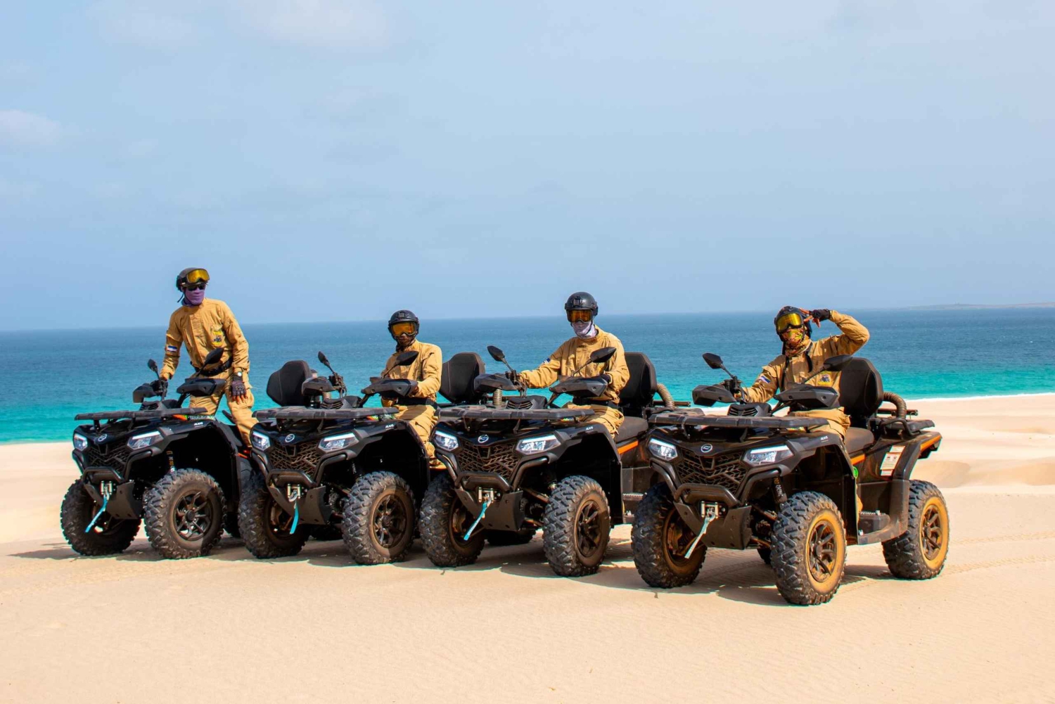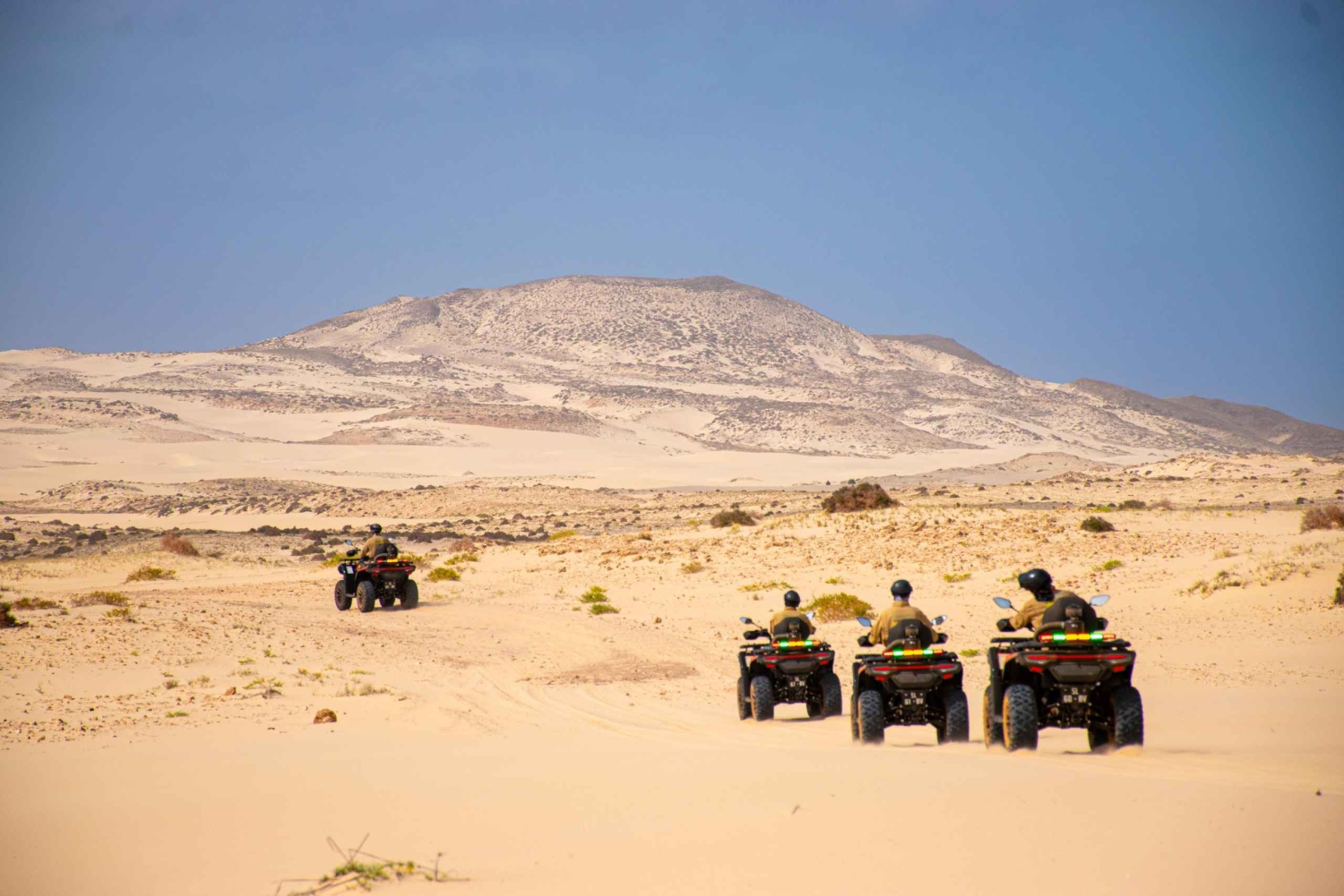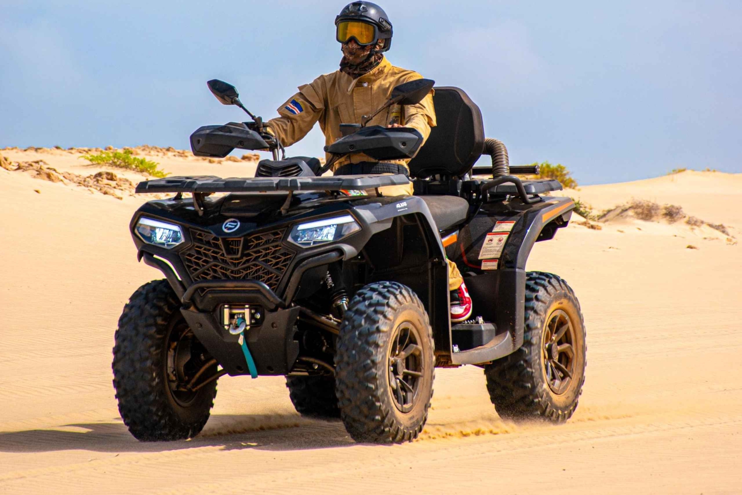 Gjør deg klar for et uforglemmelig 4-timers quad bike-eventyr på Boa Vistas sørkyst, der dramatiske landskap og skjulte perler venter. Følg våre lokale guider på en spennende tur som tar deg med til noen av øyas mest fantastiske steder. Turen begynner ved den ruvende Chamine i Praia de Chaves, et fascinerende landemerke som står mot det enorme havet i bakgrunnen. Derfra rir du videre til de fantastiske sanddynene Morro de Areia, der endeløse strekninger med gyllen sand møter Atlanterhavet - et syn som virkelig viser Boa Vistas uberørte skjønnhet. Deretter kan du oppleve den barske sjarmen ved Praia de Varandinha, en bortgjemt strand med spektakulære klipper og skjulte grotter. Ta deg tid til å utforske stranden eller bare nyte utsikten over Atlanterhavet som krasjer mot kysten. Til slutt kommer du til Povoação Velha, øyas eldste landsby, der den tradisjonelle sjarmen og det lokale livet gir et glimt inn i Boa Vistas rike kultur. Med alt utstyr og hotelltransport inkludert, er dette firehjulingseventyret designet for å være sømløst og spennende. For de som ønsker å oppleve Boa Vista utover det vanlige, er dette et must.Includes