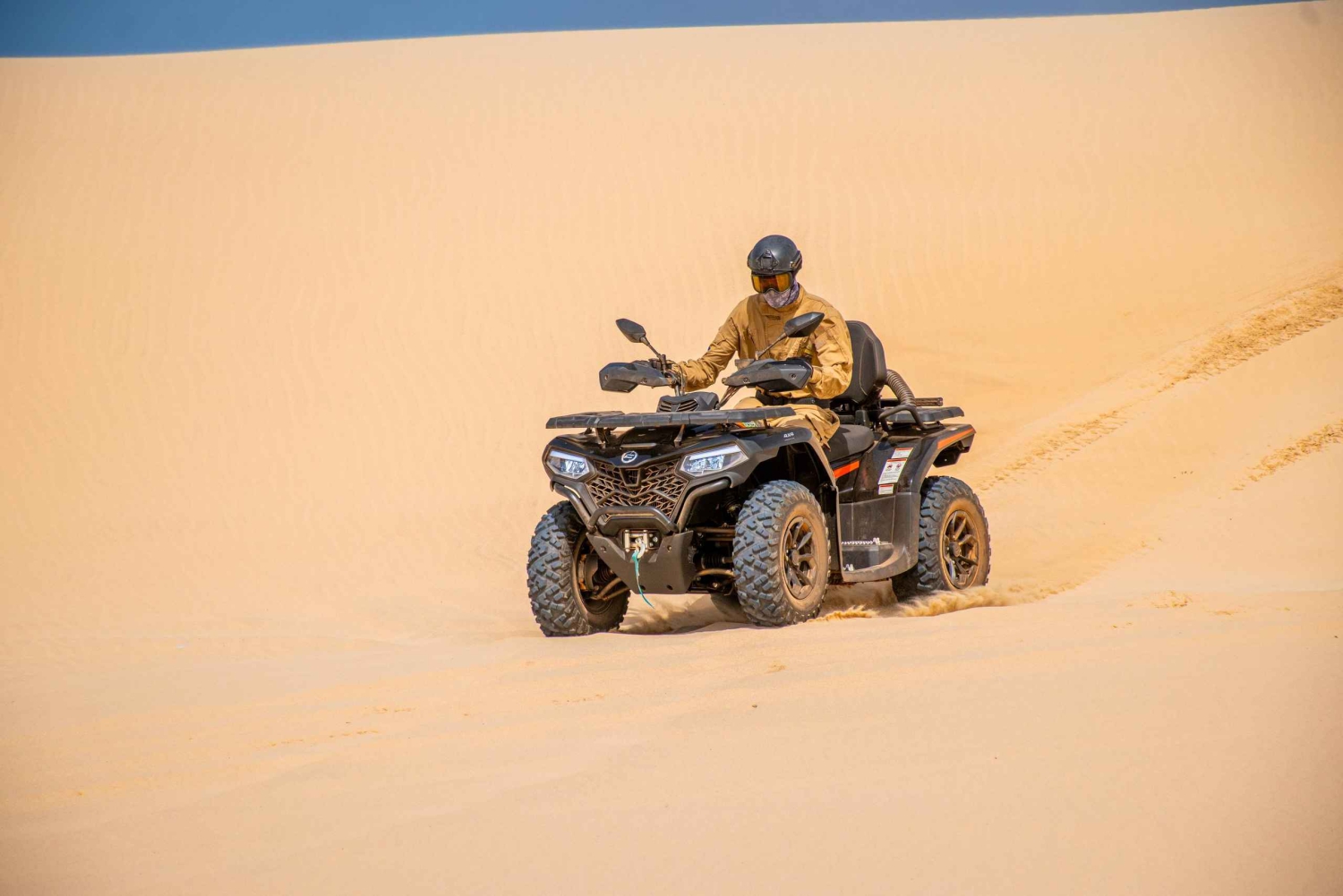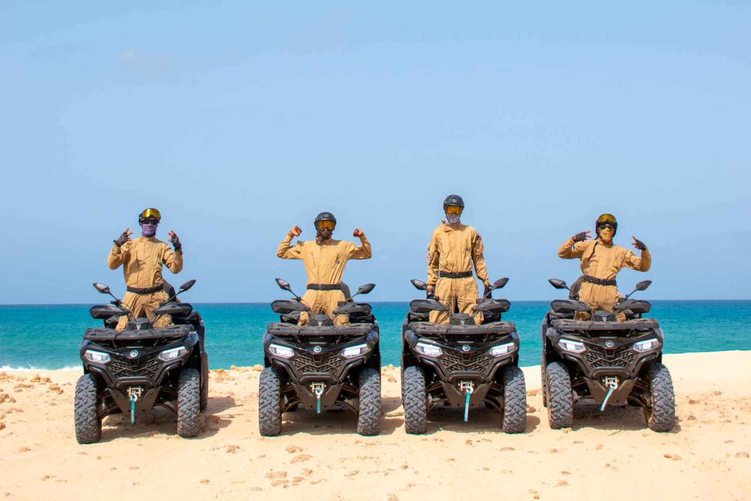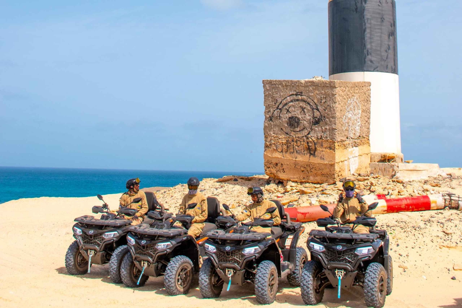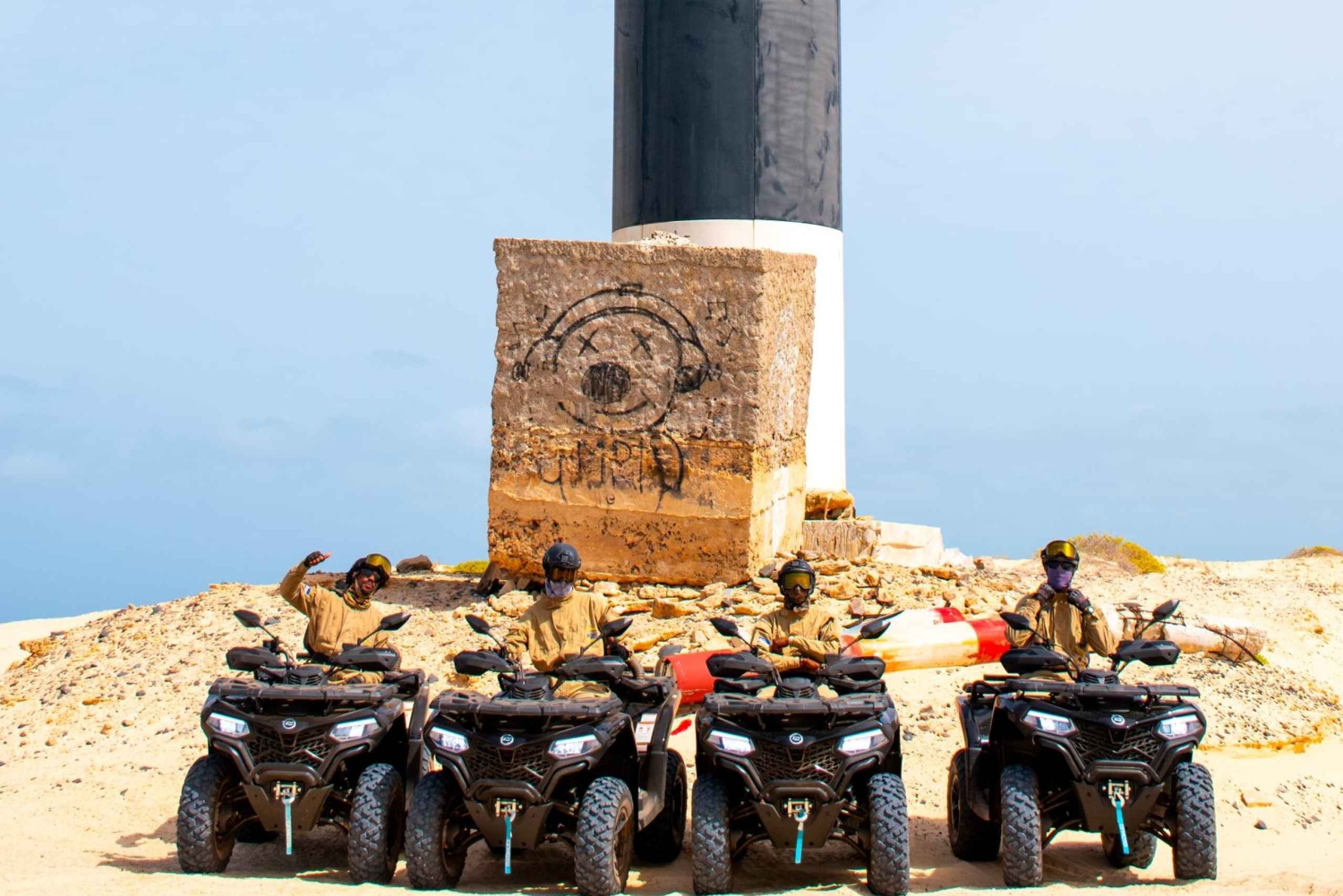 Gjør deg klar for et uforglemmelig 4-timers quad bike-eventyr på Boa Vistas sørkyst, der dramatiske landskap og skjulte perler venter. Følg våre lokale guider på en spennende tur som tar deg med til noen av øyas mest fantastiske steder. Turen begynner ved den ruvende Chamine i Praia de Chaves, et fascinerende landemerke som står mot det enorme havet i bakgrunnen. Derfra rir du videre til de fantastiske sanddynene Morro de Areia, der endeløse strekninger med gyllen sand møter Atlanterhavet - et syn som virkelig viser Boa Vistas uberørte skjønnhet. Deretter kan du oppleve den barske sjarmen ved Praia de Varandinha, en bortgjemt strand med spektakulære klipper og skjulte grotter. Ta deg tid til å utforske stranden eller bare nyte utsikten over Atlanterhavet som krasjer mot kysten. Til slutt kommer du til Povoação Velha, øyas eldste landsby, der den tradisjonelle sjarmen og det lokale livet gir et glimt inn i Boa Vistas rike kultur. Med alt utstyr og hotelltransport inkludert, er dette firehjulingseventyret designet for å være sømløst og spennende. For de som ønsker å oppleve Boa Vista utover det vanlige, er dette et must.Includes