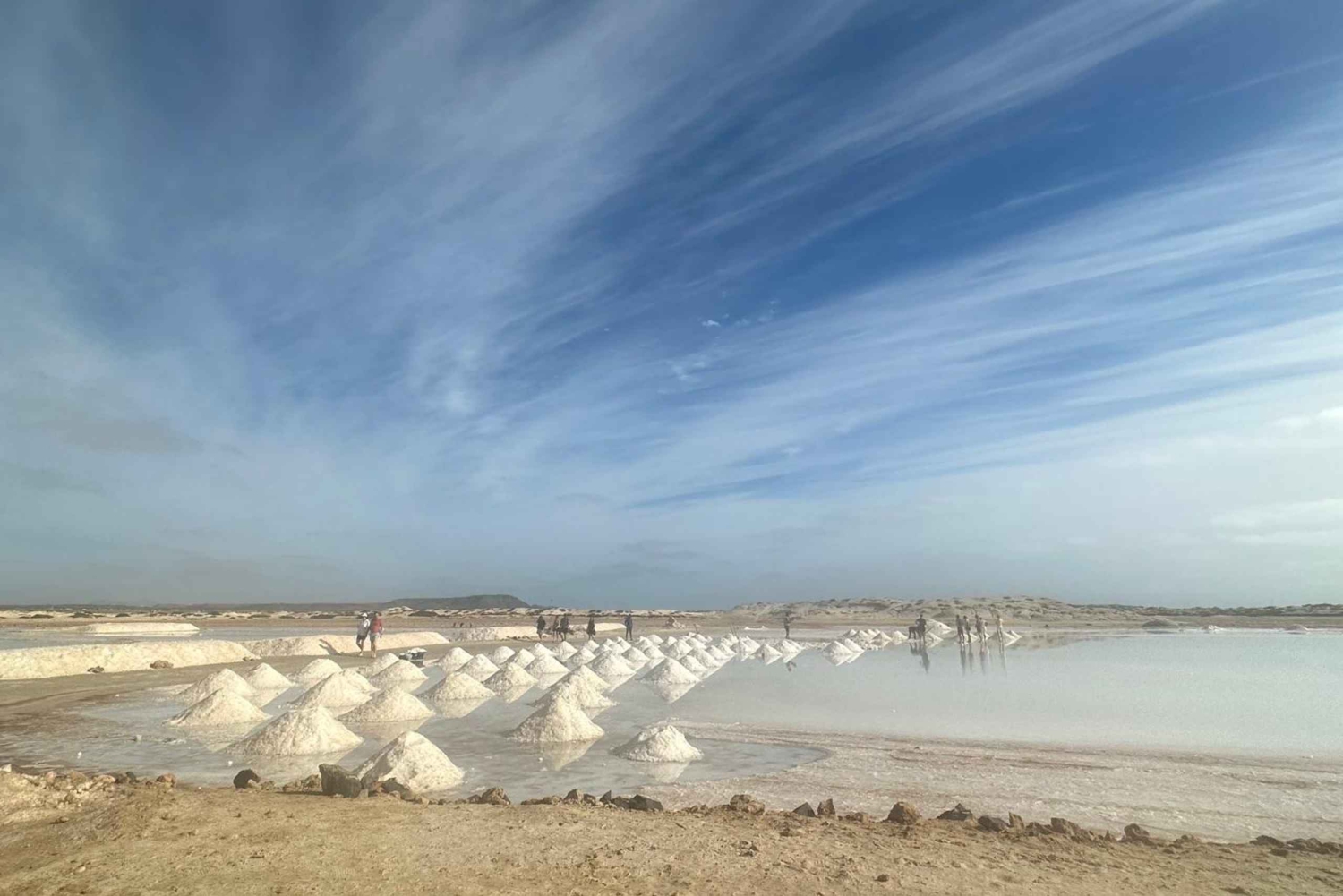 Embarca numa aventura emocionante com os teus companheiros mais próximos enquanto exploras as maravilhas cativantes da Ilha do Sal num tour particular exclusivo! Apanha-nos: *Hotéis Mélia: 08:50 AM *Hotéis RIU: 09:00 AM *Santa Maria: 09:15 AM pelo nosso guia, pronto para te levar numa viagem inesquecível por Cabo Verde (por favor, note que às vezes pode haver um ligeiro atraso no horário de busca). Durante as próximas seis horas, prepara-te para descobrir as jóias escondidas de Cabo Verde. Irás visitar: *Murdeira - A encantadora vila de Murdeira, onde serás recebido por uma baía de cartão postal com alguns dos melhores pontos de snorkeling. O nosso guia irá contar-te algumas histórias fascinantes sobre como surgiu este pedaço de paraíso. *Salinas - Passaremos pelas hipnotizantes Salinas, onde poderás mergulhar e brincar num lago salgado que é tão refrescante como único. *Buracona - Prepara-te para Buracona - onde se encontra o místico Olho Azul, onde poderás mergulhar num mundo de maravilhas que te deixará sem fôlego. *Almoço - Estás com fome depois de toda esta excitação? Não tenhas medo! Temos uma pausa para almoço onde poderás deliciar-te com uma cozinha local de fazer crescer água na boca, que é tão deliciosa como económica. Confia em nós, as tuas papilas gustativas vão agradecer-te mais tarde! *Baía de Parda - Ainda não acabámos! A nossa aventura continua enquanto damos um mergulho na Baía de Parda, onde terás a oportunidade de ver tubarões-limão a deslizar graciosamente pelas águas cristalinas. É uma adrenalina! *Espargos - Prepara-te para uma visita guiada a Espargos! Passeamos pela cidade, apreciando as vistas e os sons, antes de mergulharmos de cabeça na miragem do deserto. É como entrar numa ilusão de ótica da vida real - prepara-te para tirar fotografias inesquecíveis *Desembarque no teu hotel/apartamento (O itinerário da excursão pode não ser sempre o que está na lista, no entanto, verás todos os locais mencionados acima) IMPORTANTE Por favor, toma nota da taxa extra e mais abaixo: *Paragem para almoço paga pelo cliente *Entrada em Salinas 6 Euros *Entrada para o Blue eye 3 Euros *SharkBay 5 Euros (extra se precisares de crocodilos / é melhor trazeres os teus) *Traz a tua própria toalha *Traz roupa de banho *Uma garrafa de água opcional *Loção de proteção solar opcional *Óculos de sol opcionais *Snacks se tiveres fome antes do almoço Opcional Então, de que estás à espera? Põe o teu sentido de aventura e prepara-te para mergulhar na emoção de uma vida connosco em Cabo Verde!Includes