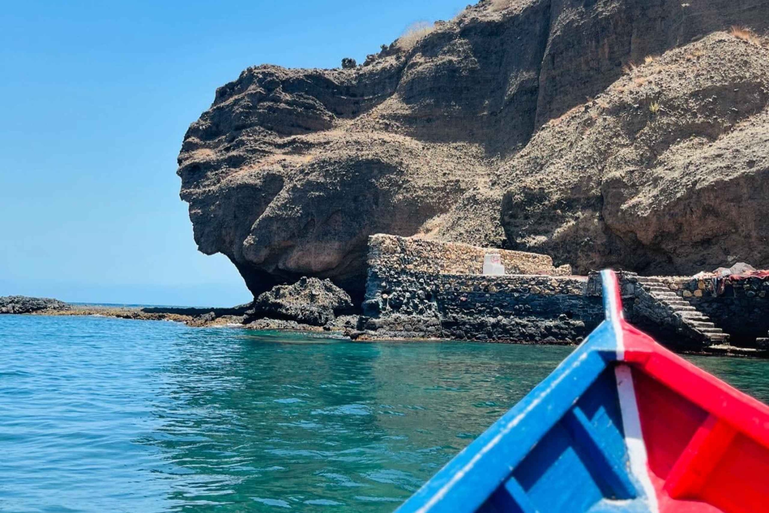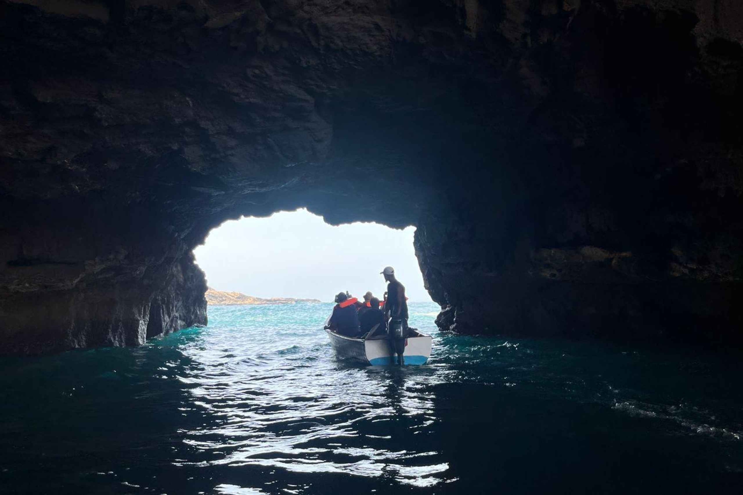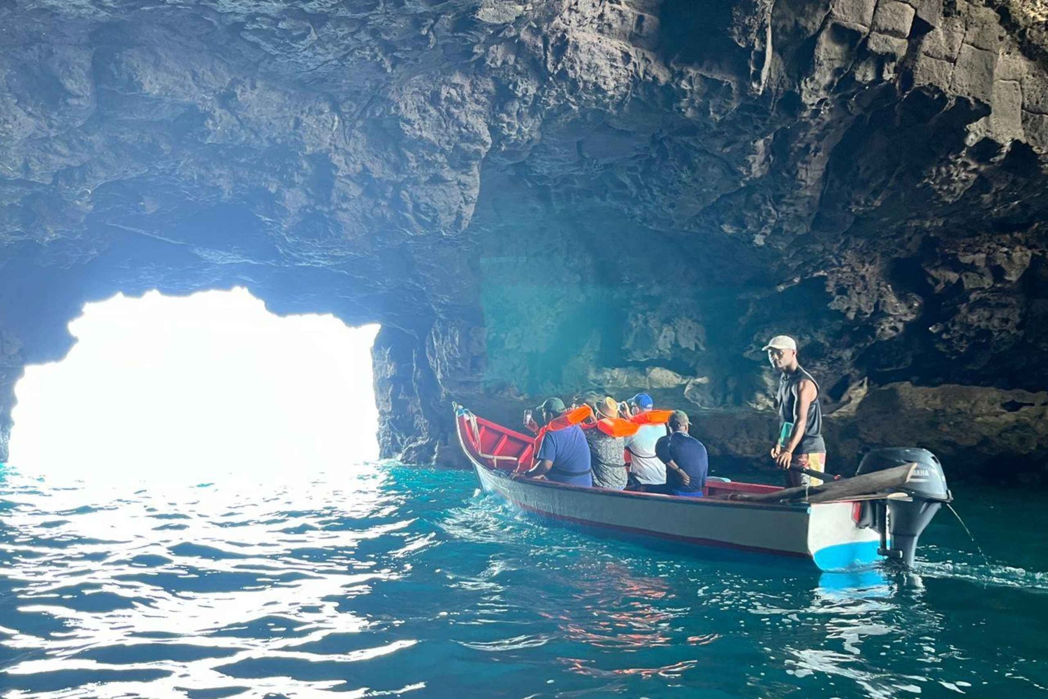 Поездка на лодке к пещере Агуас Белас + барбекю на пляже. Встреча утром у места вашего проживания, отправление на север острова в небольшую рыбацкую деревню Порту-Рибейра-да-Барка, оттуда вы сядете на красочную традиционную рыбацкую лодку, чтобы добраться до знаменитой пещеры. Расположенная в 3 км от деревни пещера является волшебным местом для открытия. Во время поездки у вас будет возможность почувствовать морской бриз, шум волн, оценить красивые пейзажи вокруг, а иногда можно увидеть черепах. У вас также будет возможность войти в пещеру и поплавать внутри нее. После посещения пещеры вы остановитесь на небольшом райском пляже с черным песком, чтобы искупаться и приготовить барбекю.Includes
